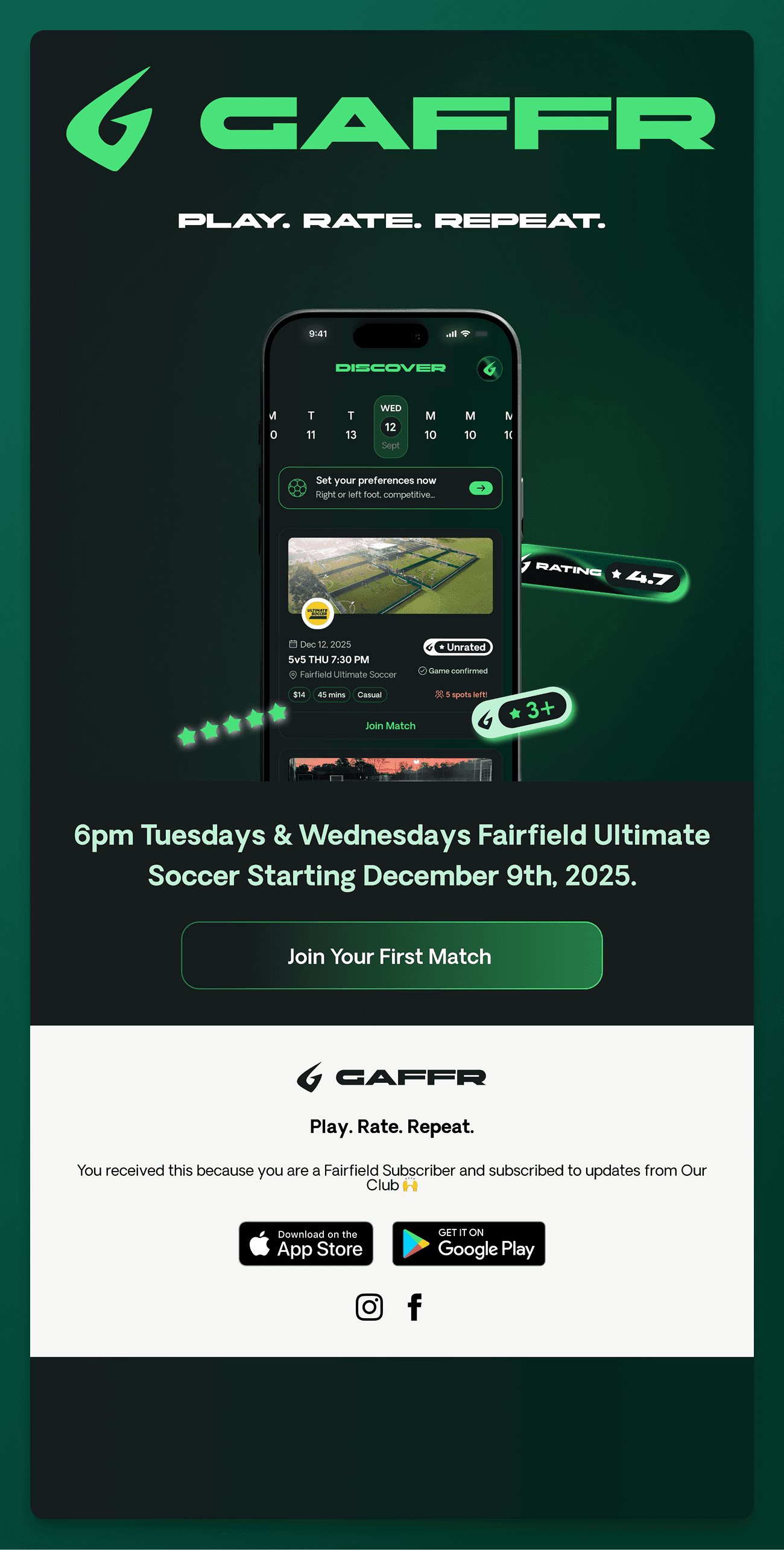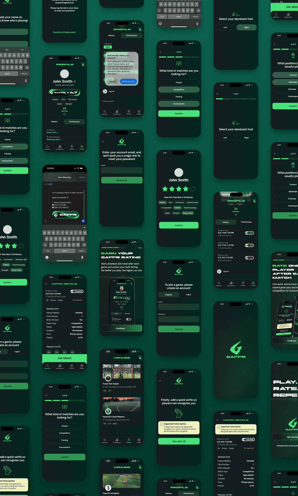 Gaffer is a next-generation football app built for casual players, weekend warriors, and competitive small-sided teams across Sydney. The platform helps players discover matches, join teams, chat with teammates, and earn ratings through a unique fair-play scoring system designed to make every game more fun, social, and competitive. The project included full brand design, product ideation, UX/UI design, website design and build, and a complete mobile MVP built in under six weeks, and months of refinement and testing resulting in a fast, modern, football-native experience loved by players all over the city.