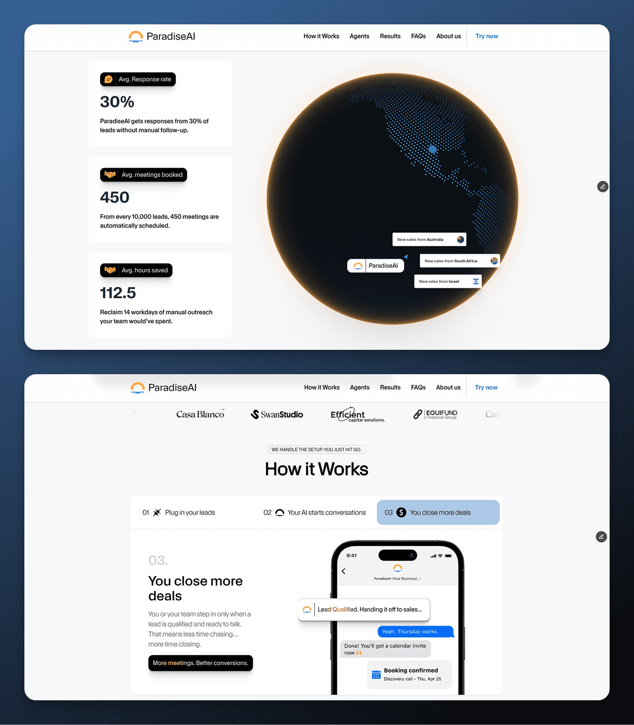 Strong hierarchy, clean content structure, interactive elements, and crisp visuals helped position ParadiseAR as a sophisticated AI solutions company ready for clients, partners, and investors.