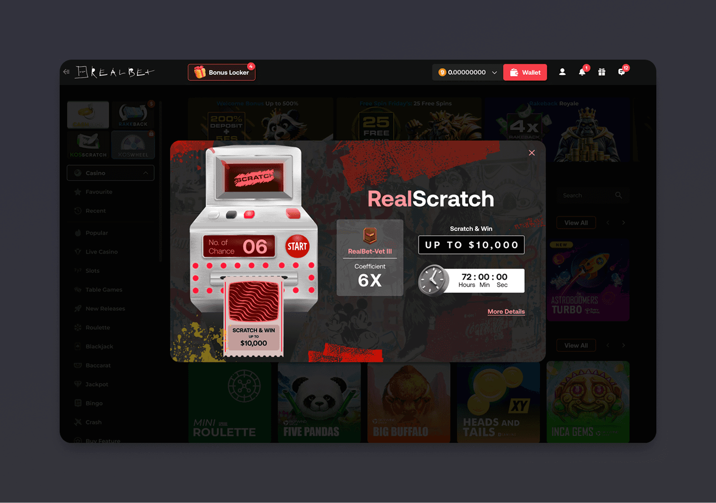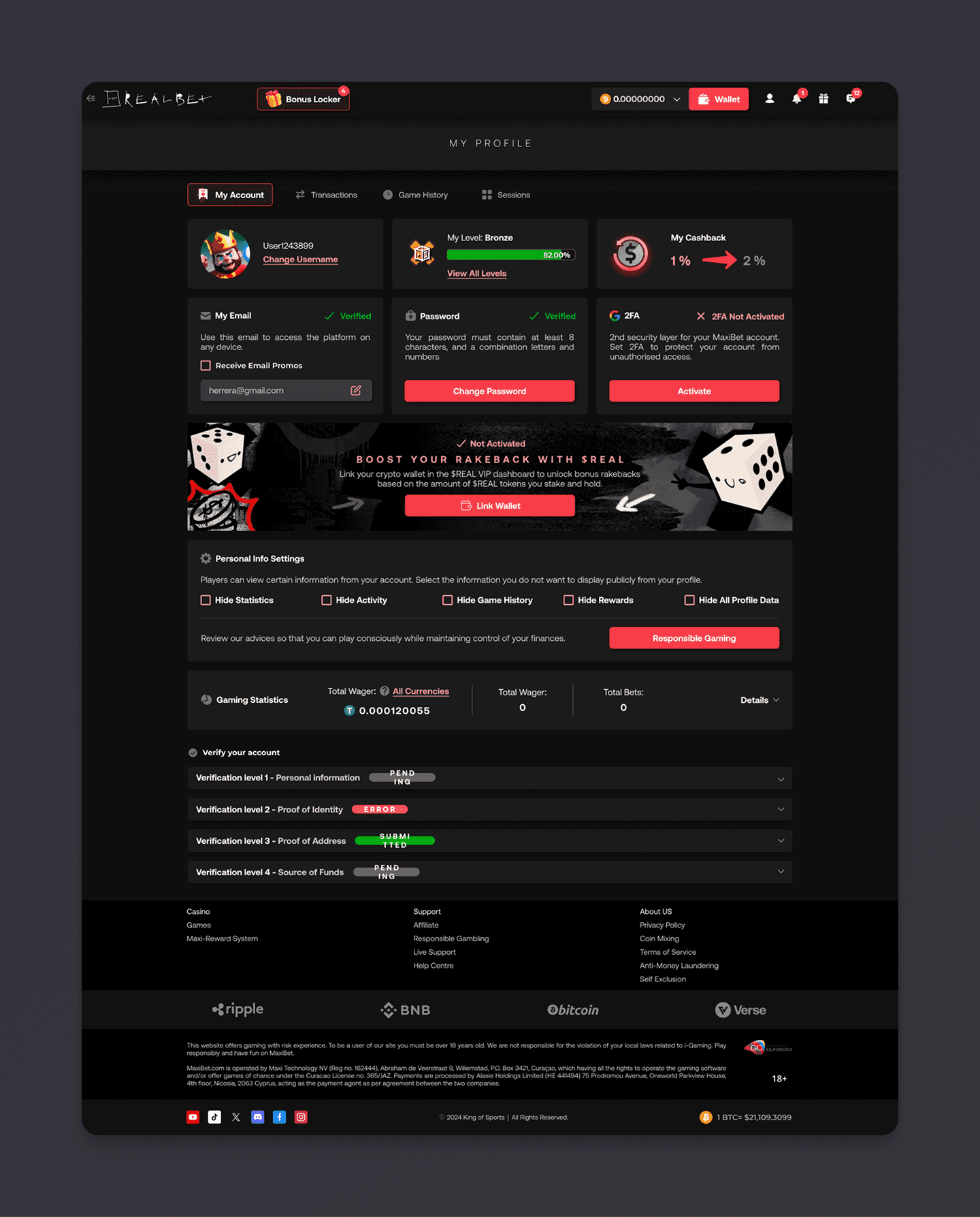 The casino needed to be crypto-native but not crypto-confusing. Wallet connectivity, deposits, withdrawals, and on-chain interactions needed to feel intuitive for everyday fans, not just Web3 natives.Ensuring the visual identity matched the Real brand philosophy