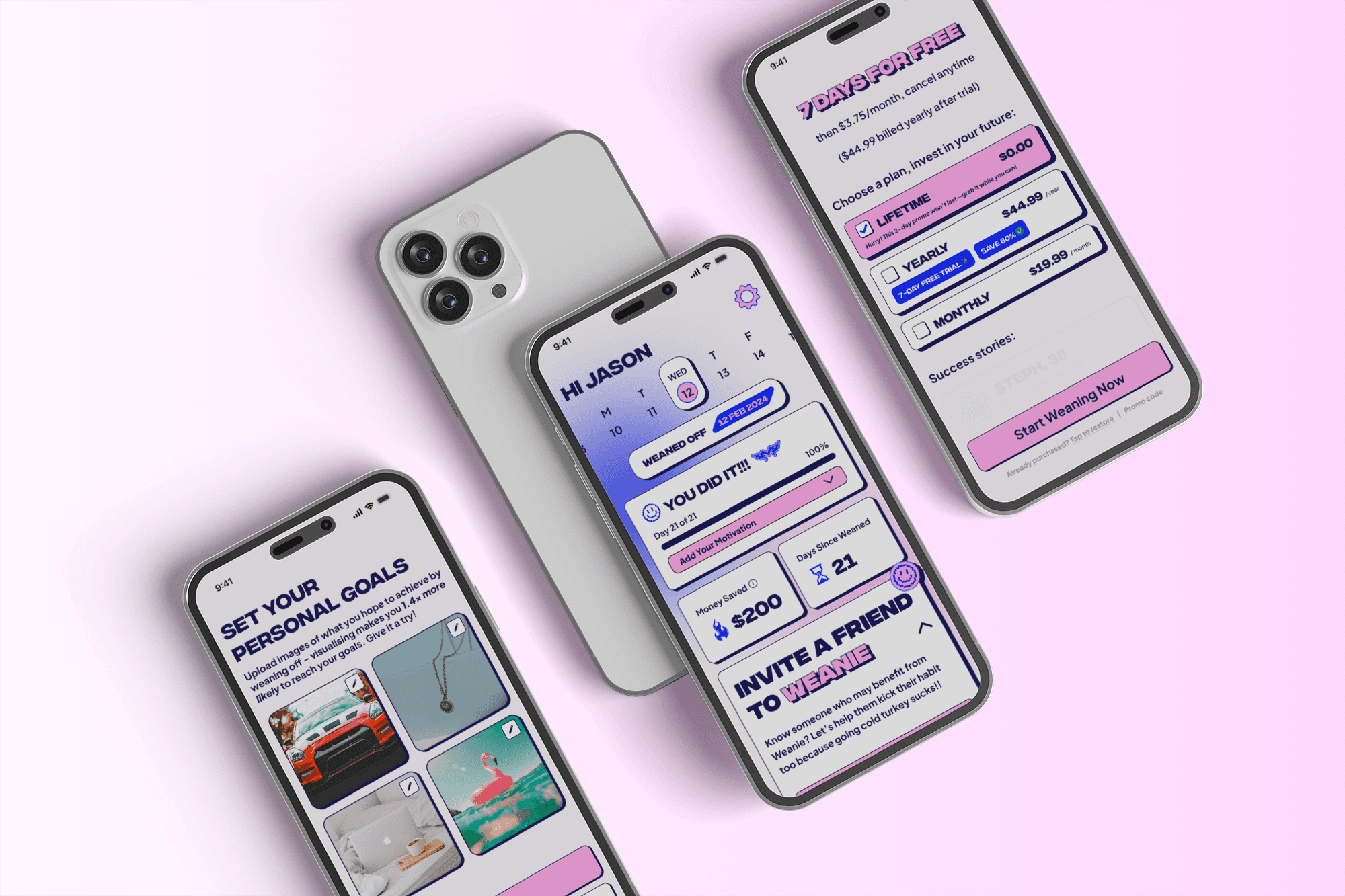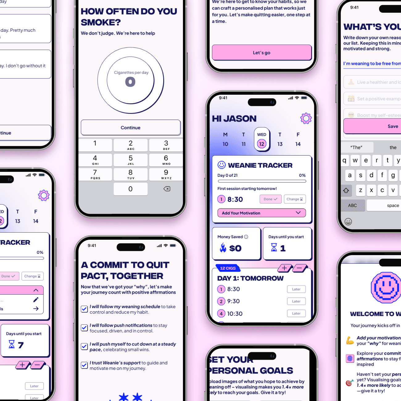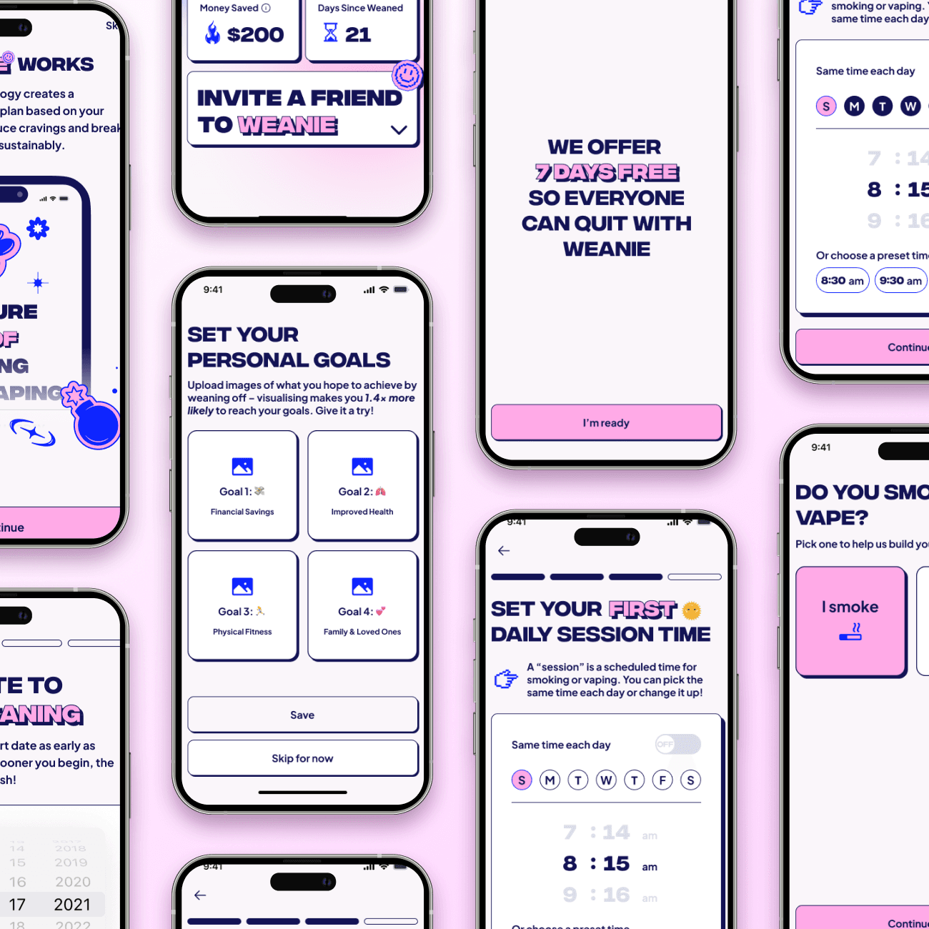 Most quitting apps focus on the “after.” Weanie focuses on the process, the weaning-off itself. Crafting a gradual reduction model that felt achievable, safe, and flexible required deep research into behavioural psychology and habit formation.